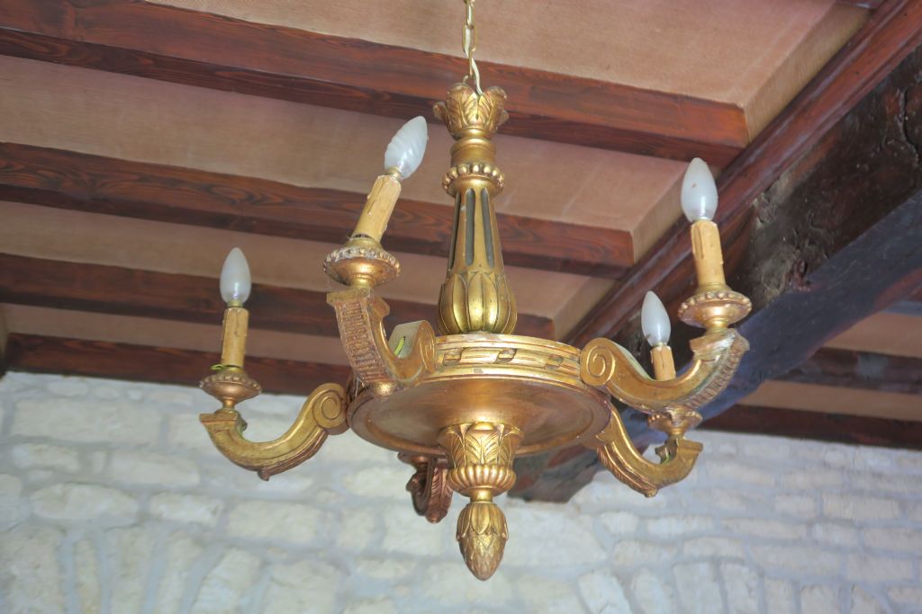Lustre de style Louis XVI en bois sculpté et doré à décor de pomme de pin et de palmes éclairant à cinq lumières. H. 60 cm.
