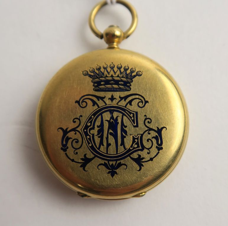 Montre de col en or à décor émaillé bleu. Poids tel : 24 g