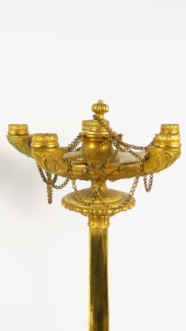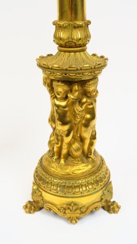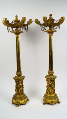 Paire de candélabres Restauration en bronze doré à décor de ronde d'amours et d'athénienne. H. 81 cm