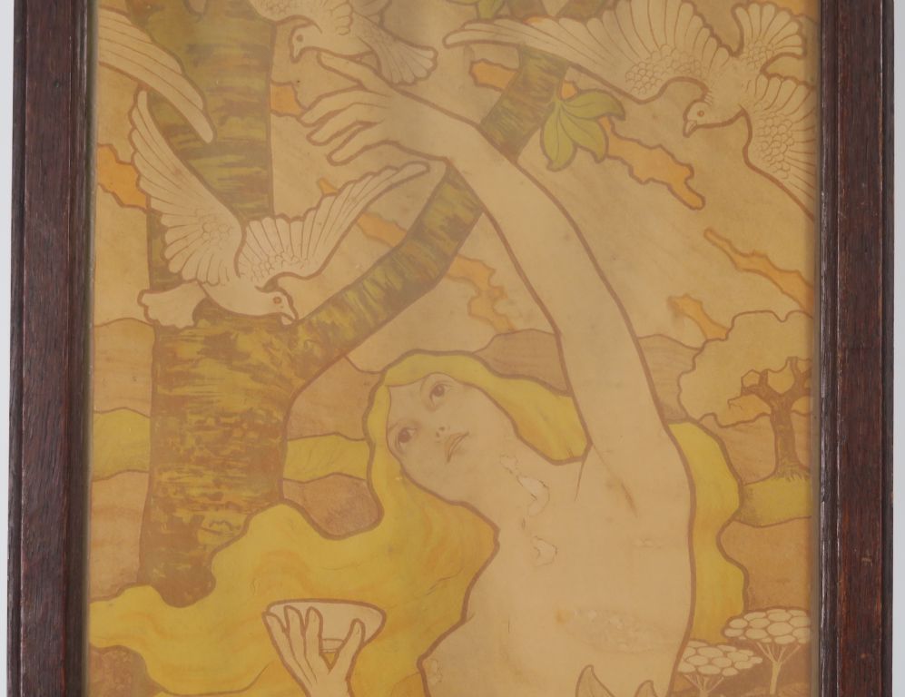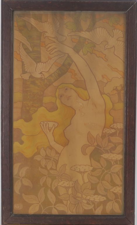 Paul BERTHON "Nymphe nue appelant un vol de colombes" Lithographie. Monogrammée en bas à gauche.