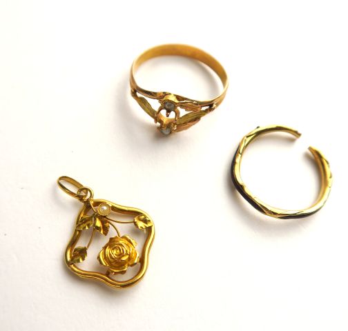 Pendentif en or à décor d'une rose, rehaussée d'une perle. On y joint un monture de bague (manque la pierre centrale), débris de bague. Poids : 3 g