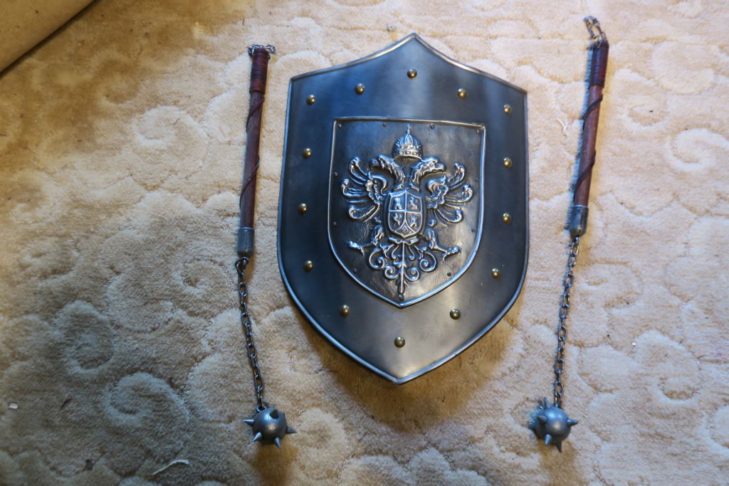 Réplique de bouclier. 2 masses d'armes.