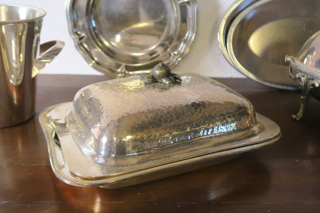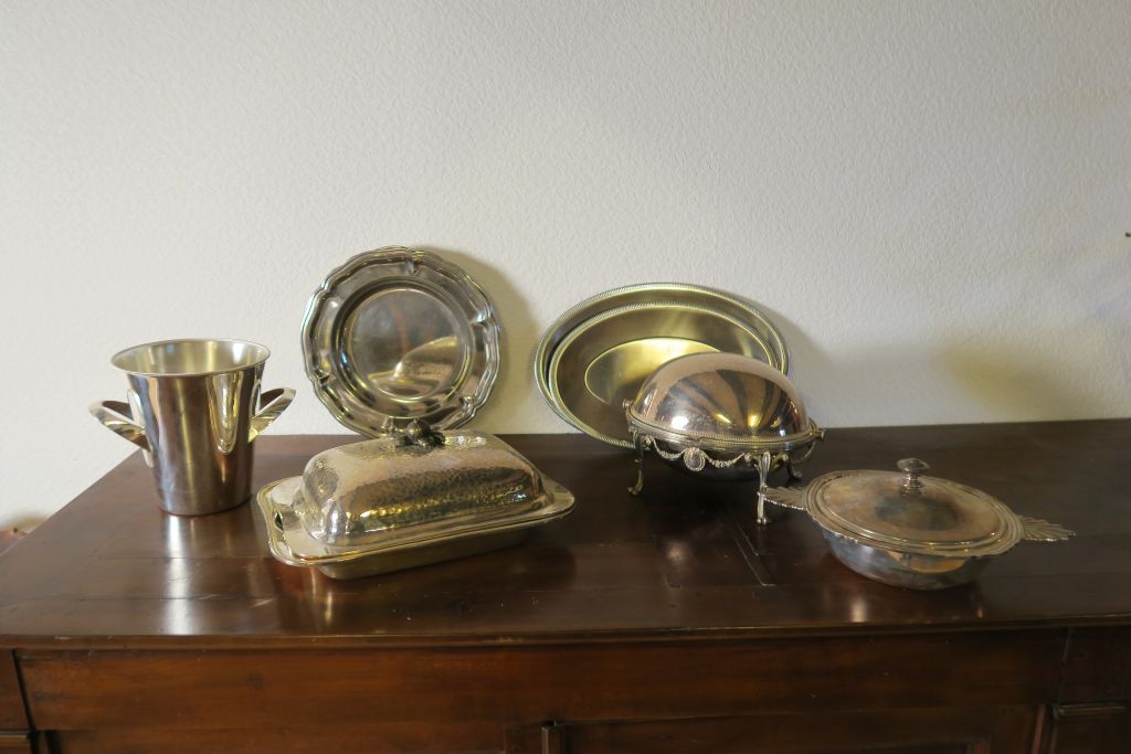 Seau à champagne une soupière un légumier un réchaud 2 plats ronds et deux plats ovale, l'ensemble en métal argenté
