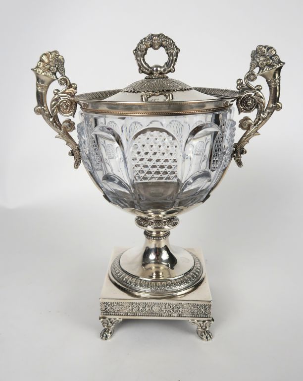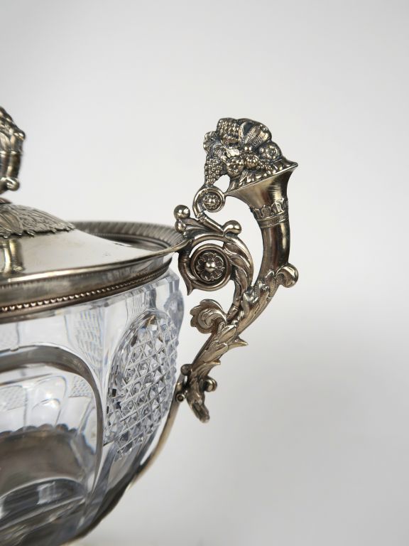 Sucrier Restauration en cristal taillé et argent, poinçon Vieillard, à décor de cornes d’abondance, de fleurs, de feuillage et de rais de coeur. Poids tel : 860 g