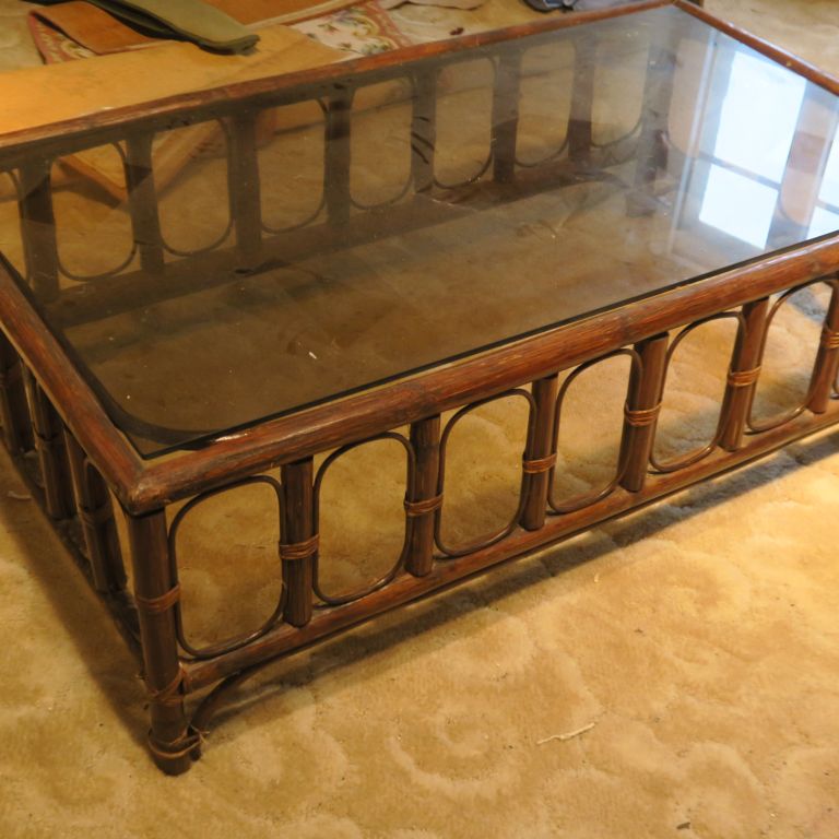 Lot de Table basse en bois en verre et rotin. Dim. 36 x 113 x 65.5 cm. au prix de 60 à 80 € en vente aux enchères par l'hôtel des ventes Primardeco