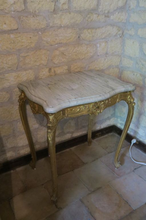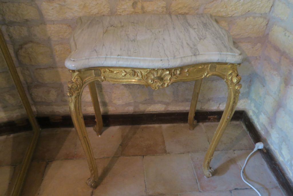 Table de milieu de style Louis XV en bois mouluré et sculpté à décor de rocaille et de fleurs, dessus marbre gris Dim. 72 x 65 x 47 cm. (sauts de dorure)