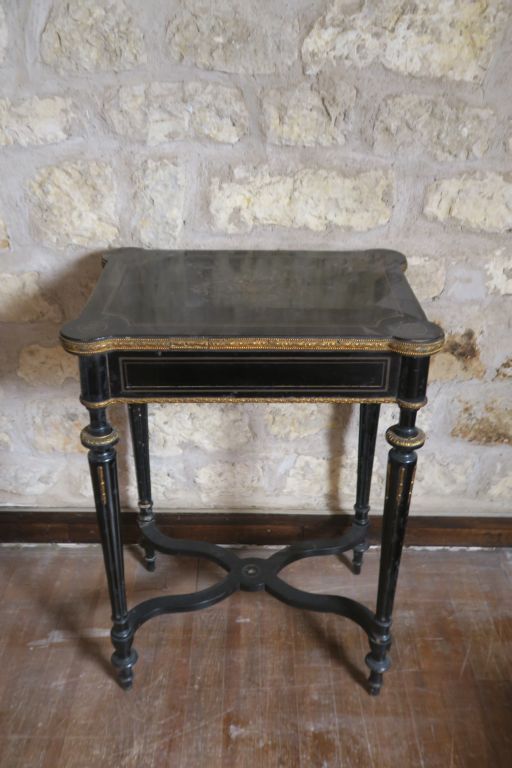 Travailleuse Napoléon III de style Louis XVI en bois noirci et marqueterie Boulle, ouvrant à un abattant, intérieur en acajou. Dim. 75 x 54.5 x 40 cm.