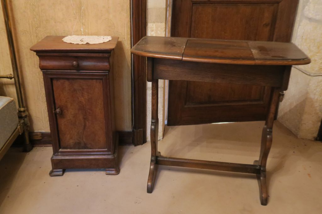 Travailleuse rustique en bois naturel, ouvrant à un abattant. Chevet Louis Philippe ouvrant à une porte et un tiroir.