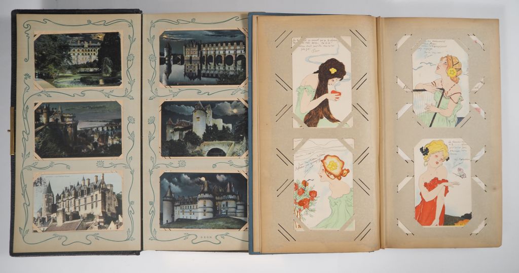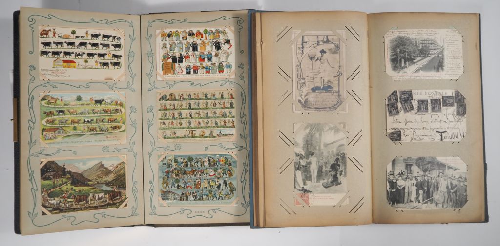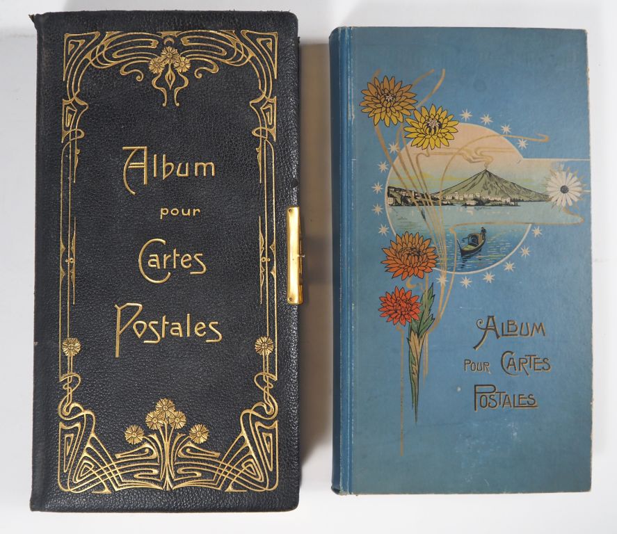 2 albums de cartes postales vers 1900, reliures de style Art Nouveau