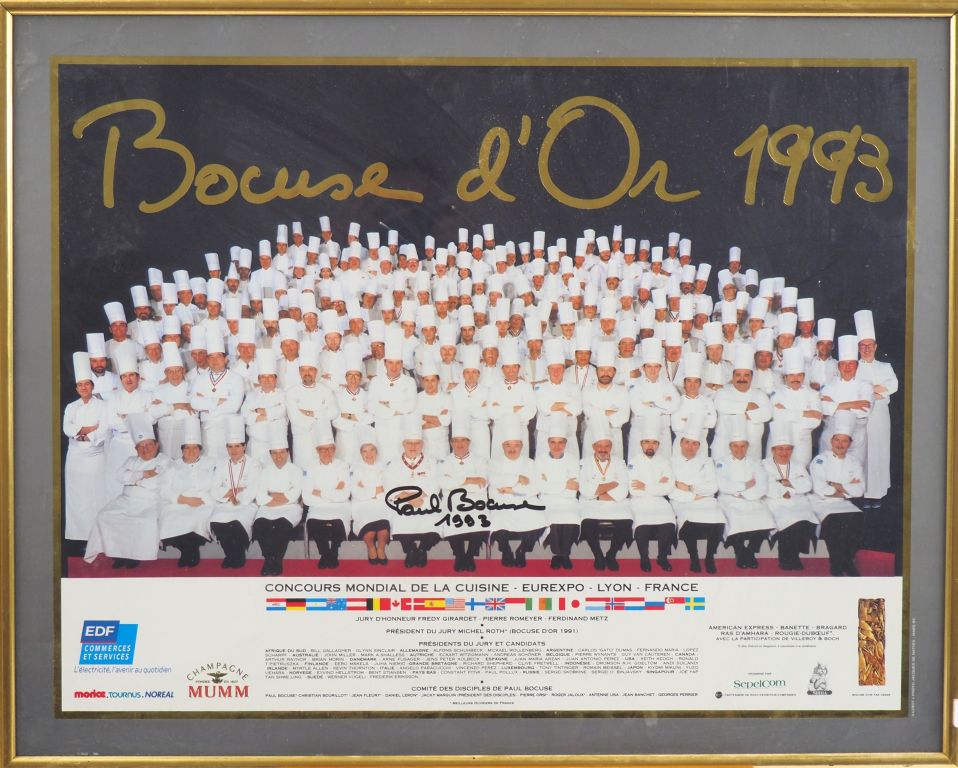 Affiche des Bocuse d'or dédicacée par Paul Bocuse et datée 1993. Dim. 44 x 57 cm.
