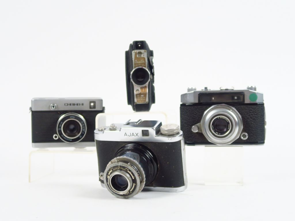 Alsaphot, Quatre appareils : - Ajax format 6x6. Objectif Saphir - Tiranty ST 280. Objectif Angenieux 2,8/45 - Durst, Duca 24x36 sur film 35 mm - Appareil fabrication russe avec un objectif 8/28