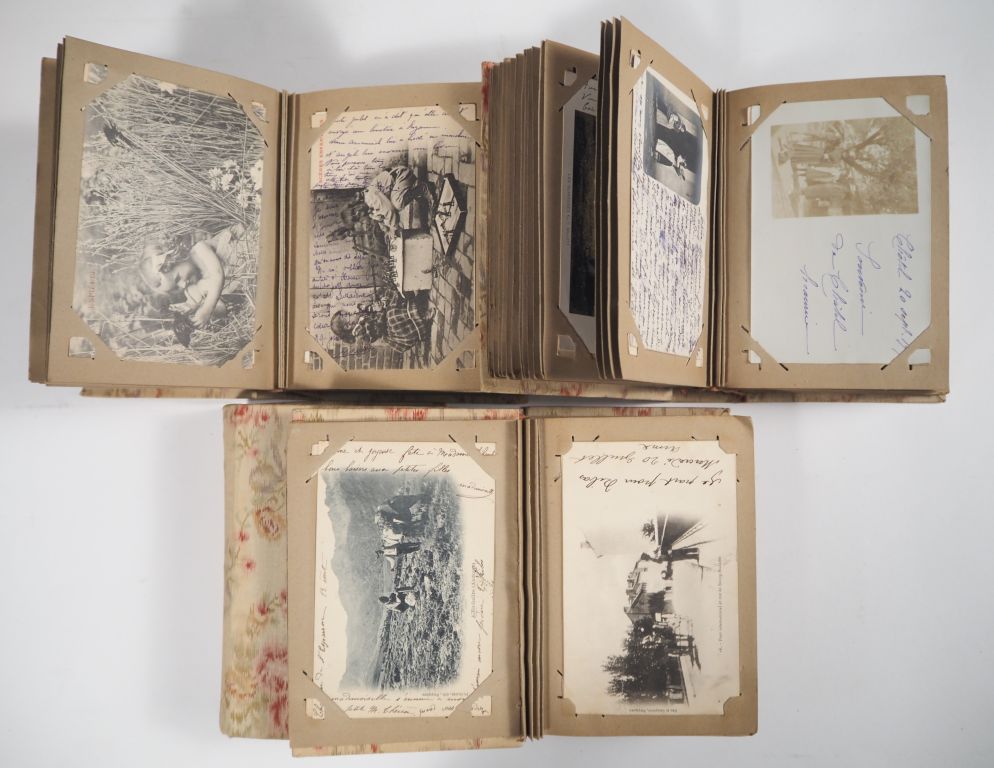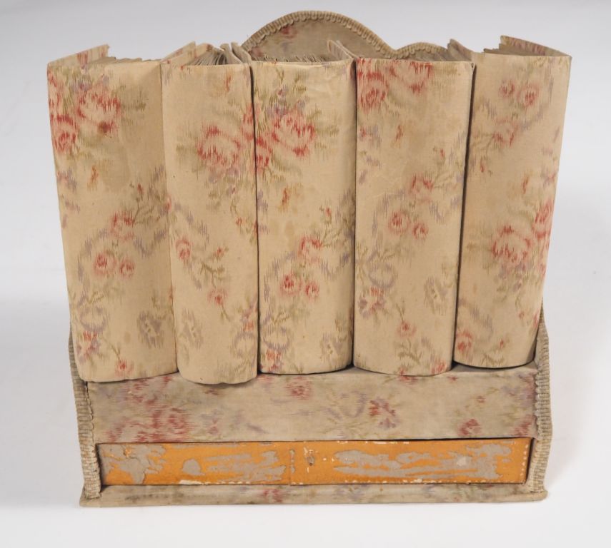 Bel ensemble de cartes postales dans cinq petits albums en forme de livres, reliures et présentoir en tissu