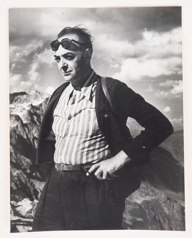BRASSAÏ (Gyula Halasz, dit) 1899-1984. Autoportrait à la montagne, ca. 1950. Photographie. Tirage argentique ca. 1960, tampon de l’auteur « ©copyright by BRASSAÏ 81, Faubourg St-Jacques PARIS 14eme Tél. 707.23.41 » au dos. 29,8 x 23,2 cm Bibliographie : « Brassaï », Revue Neuf, Robert Delpire et Pierre Faucheux, Paris, 1952, ill. couverture.