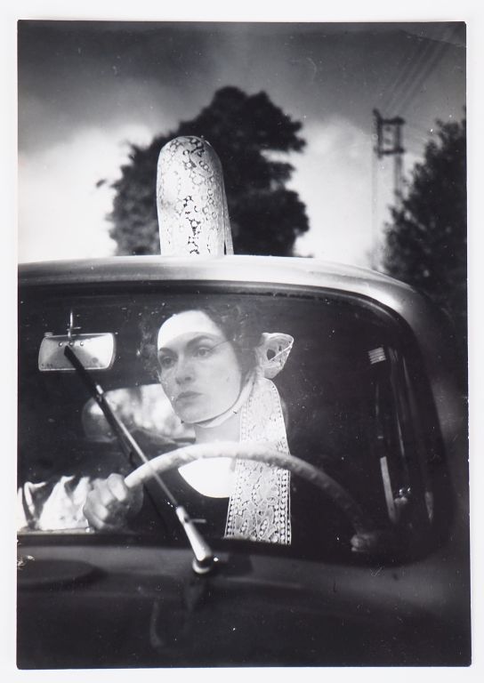 BRASSAÏ (Gyula Halasz, dit) 1899-1984 « Loctudy », Gilberte en bigoudène au volant de sa voiture 4CV, Bretagne, ca. 1960. Photographie. Tirage argentique d’époque, tampon de l’auteur « ©copyright by BRASSAÏ 81, Faubourg St-Jacques PARIS 14eme Tél. 707.23.41 », titré et daté à l’encre au dos. 15,9 x 11 cm