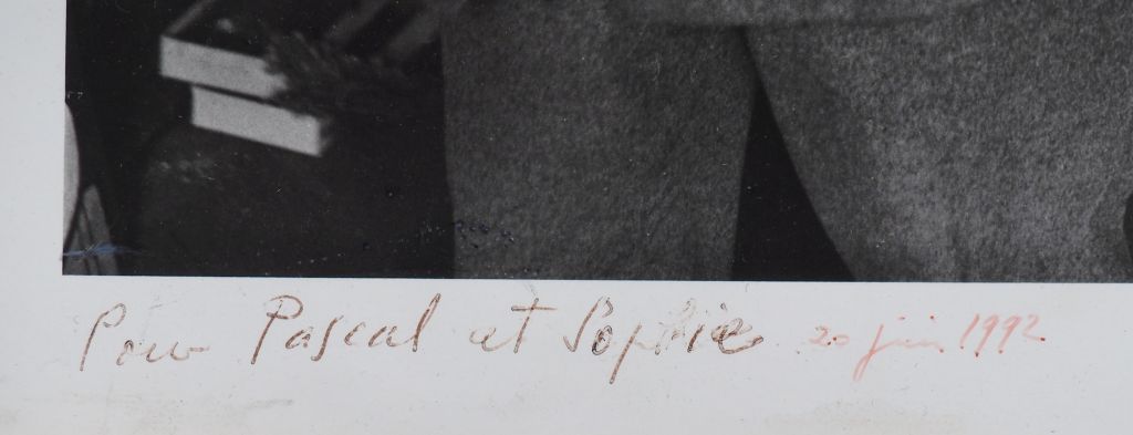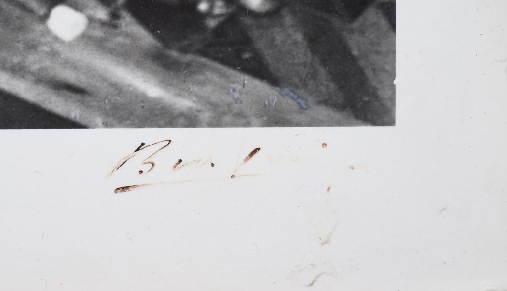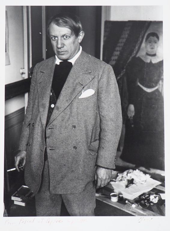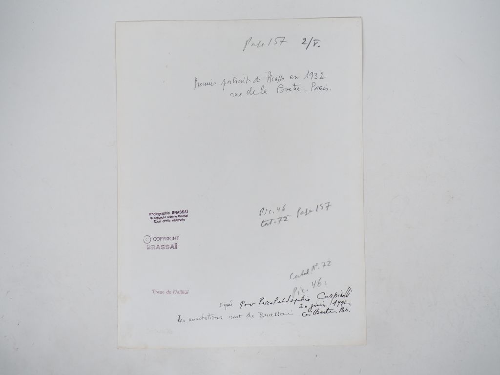 BRASSAÏ (Gyula Halasz, dit) 1899-1984. « Premier portrait de Picasso en 1932 rue de la Boétie, Paris » devant le portrait de Yadwigha par Henri Rousseau. Photographie. Tirage argentique ca. 1975 réalisé par l’auteur, signé à l’encre par l’auteur, dédicacé et daté 1992 à l’encre par Gilberte Brassaï sous l’image, annoté au crayon par Brassaï, titré, daté et dédicacé à l’encre par Gilberte Brassaï, tampons « ©COPYRIGHT BRASSAÏ », « Tirage de l’auteur » et « Photographie BRASSAÏ © copyright Gilberte Brassaï Tous droits réservés » au dos. Image : 34,8 x 26,4 cm , feuille : 39,5 x 30 cm Bibliographie : Coronet, octobre 1937, p.7. Brassaï "Conversations avec Picasso", éd. Gallimard, 1964, p.33. « Brassaï », The Museum of Modern Art, New York, 1968, p.33. Brassaï "Les artistes de ma vie", éd. Denoël, 1982, p.157. "Picasso vu par Brassaï", éd. RMN, Paris, 1987, p.41.