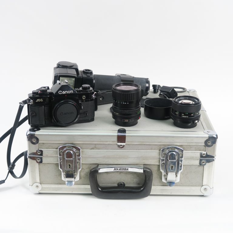 CANON A-1 n°1701127 avec deux objectifs : Objectif CANON 35-70 mm 1 : 3.5-4.5 n°1901387 Objectif CANON 50 mm 1 : 1.4 n°1060312 et paresoleil On y joint un flash CANON, l'ensemble dans une malette de transport métal HAKUBA.