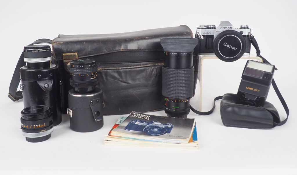 CANON AE-1 avec objectifs, accessoires et sacoche : CANON f 1 : 3.5/135 mm avec parasoleil MAKINON 1 : 2.8/f=28 mm n°816261 avec son étui CANON 1 : 1.8/f=50 mm KOMURA TELEMORE 95 II MAKINON ZOOM 1 : 3.5/f=80-200 mm n°821307 Flash CANON Notice d'utilisation