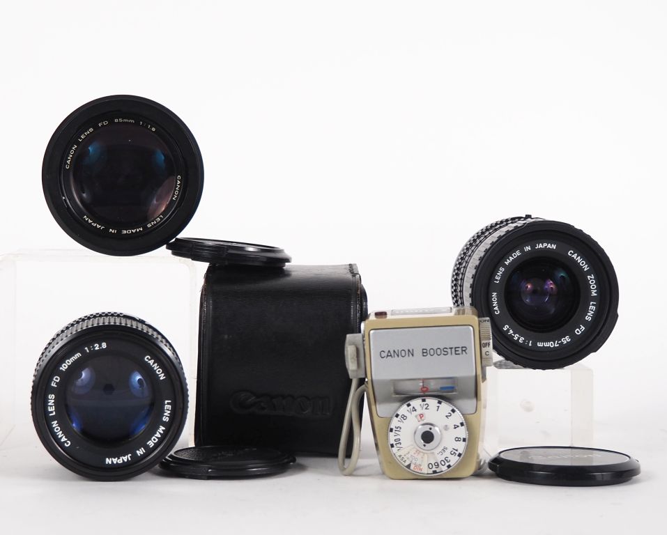 CANON. Lot de trois objectifs : - FD 1:2.8/100 n°28997 - FD 1:1.8/85 n°72235 avec pare soleil BT-52 - FD 1:3.5-4.5/35-70 n°1490426 On y joint un CANON BOOSTER dans un étui.