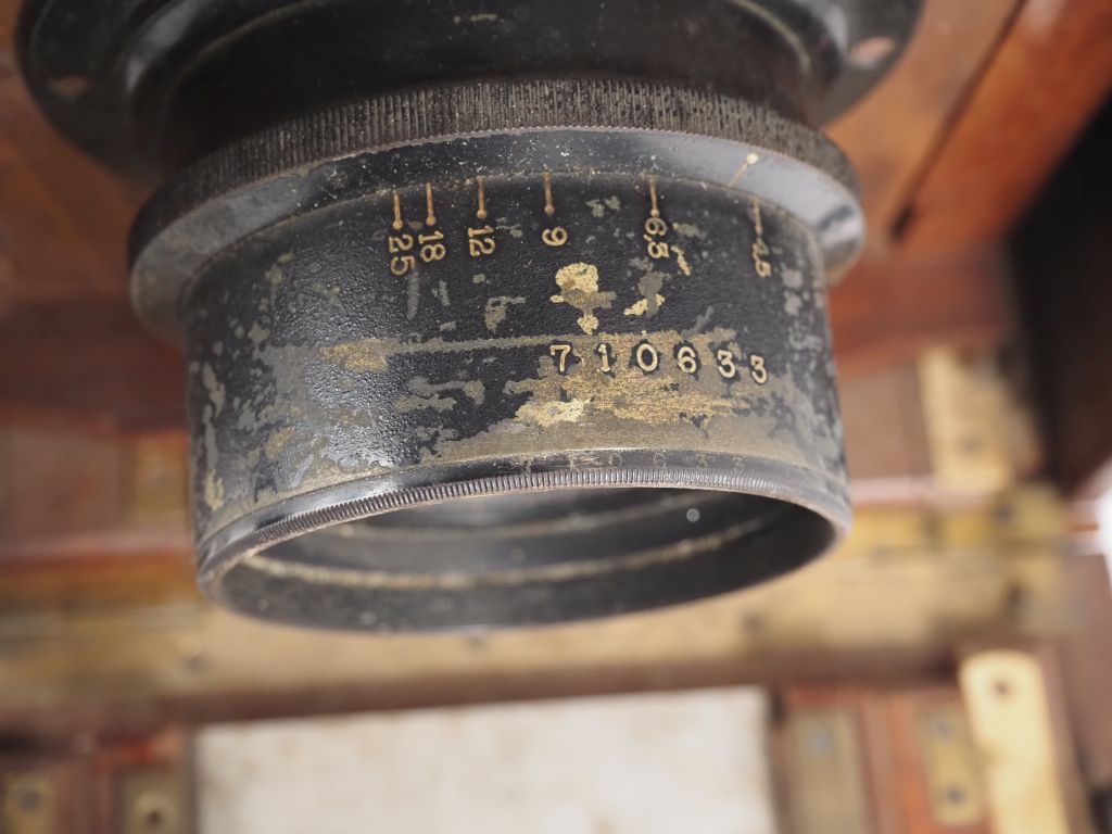 Chambre photographique 13 x 17 cm en acajou avec objectif n°710633. (accidents)