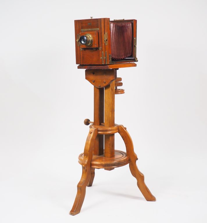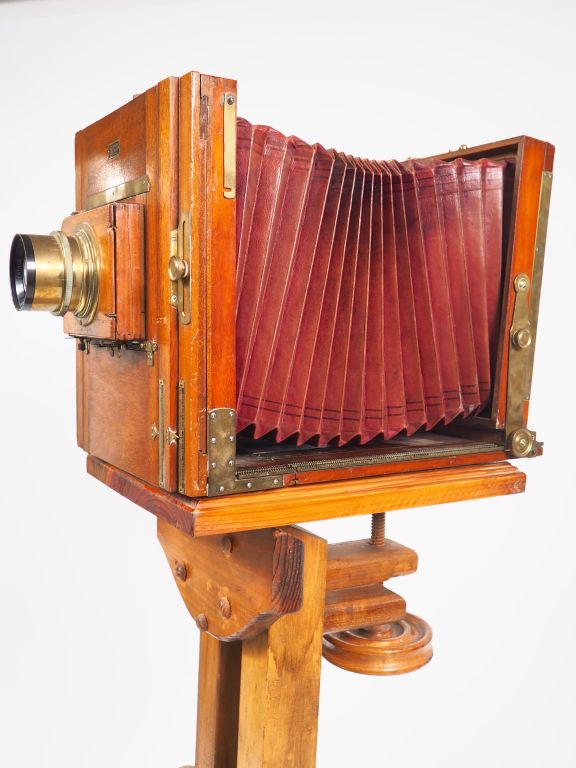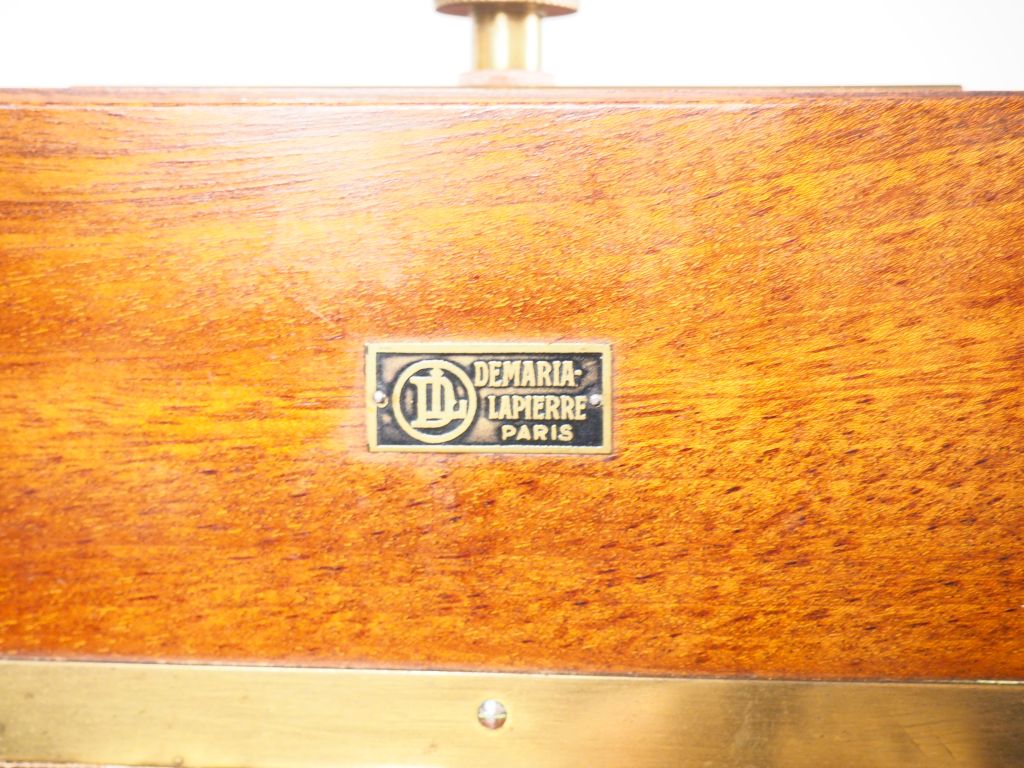 Chambre photographique en acajou à soufflet DEMARIA avec objectif BERTHIOT n°8 série II F=300mm /1:5,7 n° 223509 on y joint un grand pied en bois