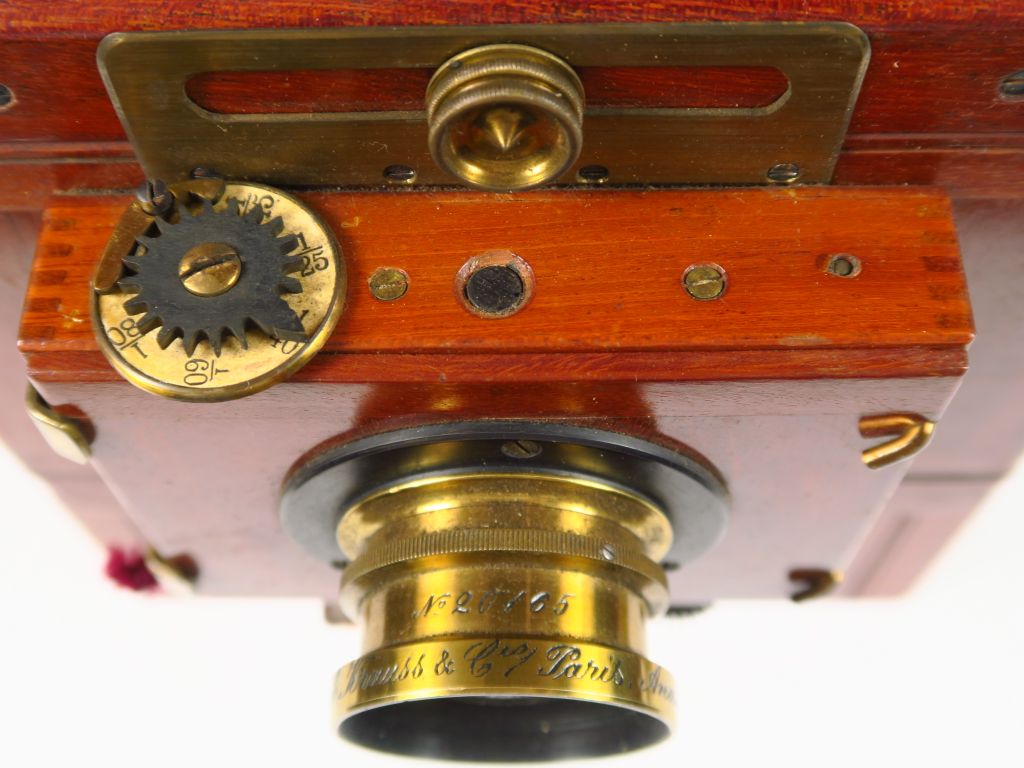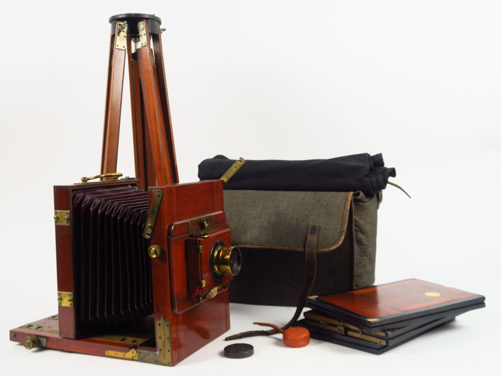 Chambre touriste en acajou 13x18 avec un soufflet bordeaux. Objectif laiton Krauss sur obturateur à rideau Thornton Pïckard. Trois châssis double avec intermédiaires 6x9 et 9x12. Un sac de transport toile. Un voile noir. Un pied acajou. Ferrures laiton.