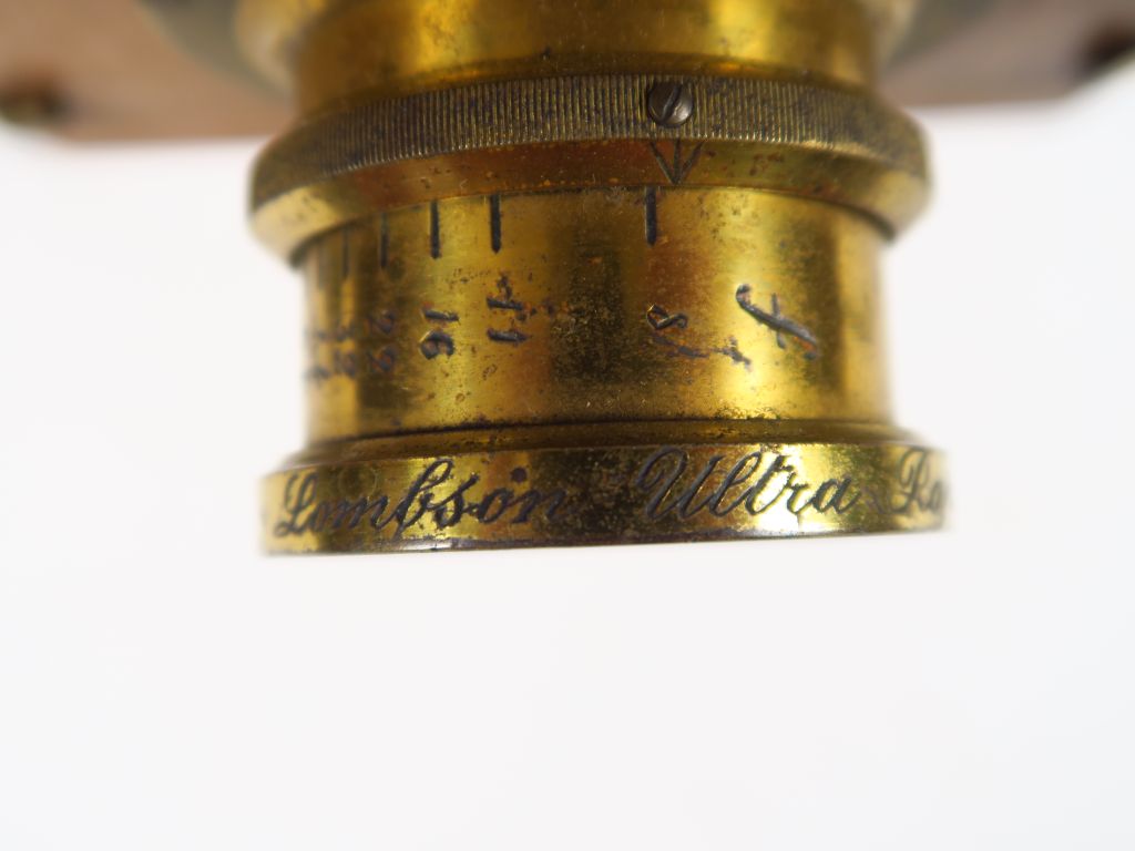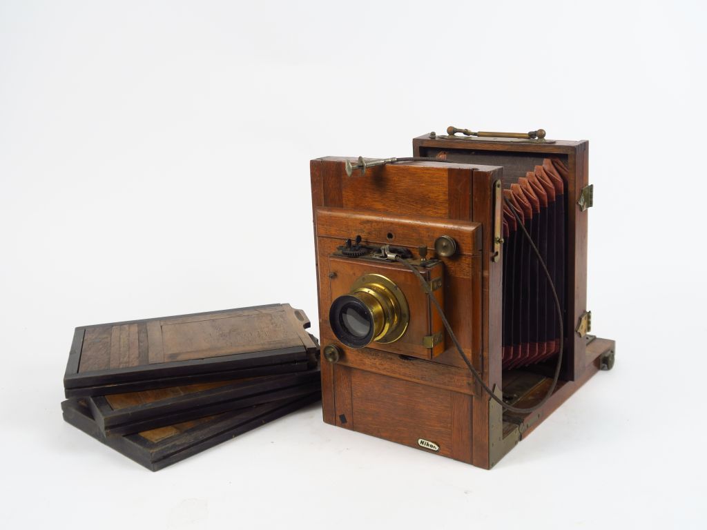 Chambre touriste en bois 13x18 avec ferrures laiton. Soufflet avec coins renforcés. Objectif laiton Lombson ultra rapide. Obturatateur à rideau à déclencheur souple et trois châssis double.