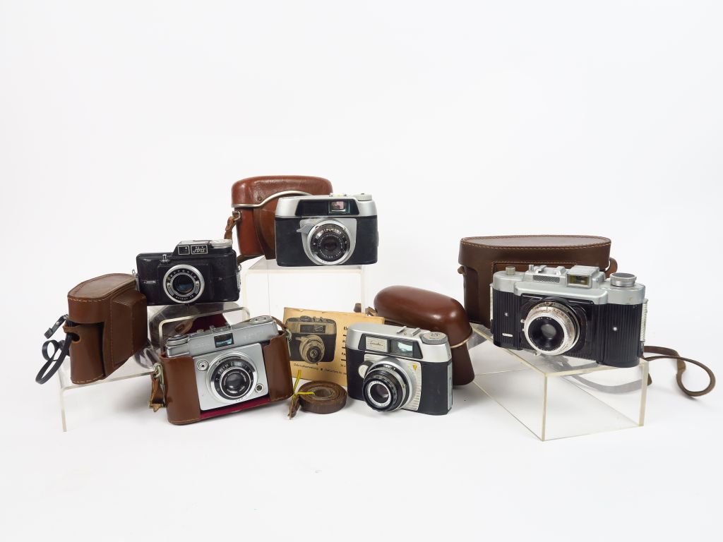 Cinq appareils : - Dacora avec étui. - Isco avec étui et notice - Franka avec étui - Ferrania, Ibis. Sac - Fex 6x9 bakélite