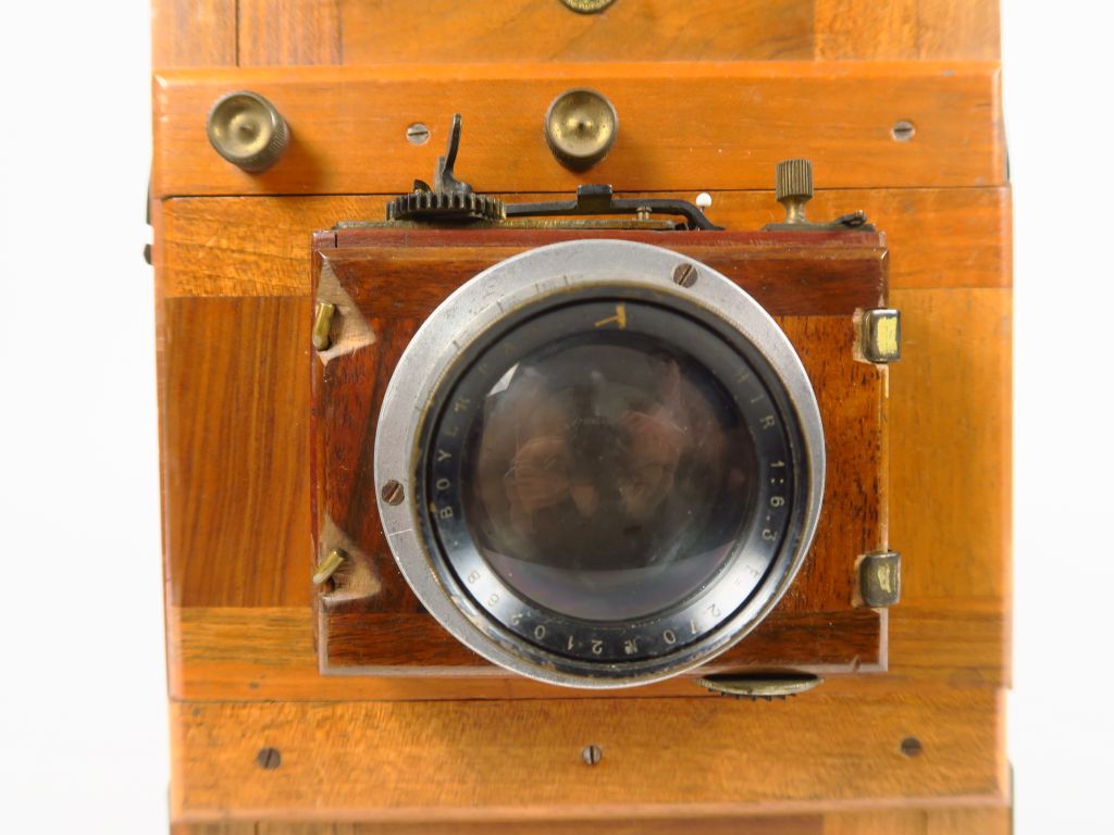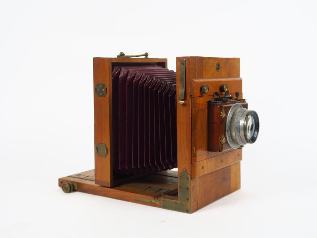 DEMARIA-LAPIERRE. Chambre touriste 13x18. Ferrures en laiton. Un soufflet bordeaux. Objectif Boyer saphir 6,3/270 mm. Sur obturateur à rideau.