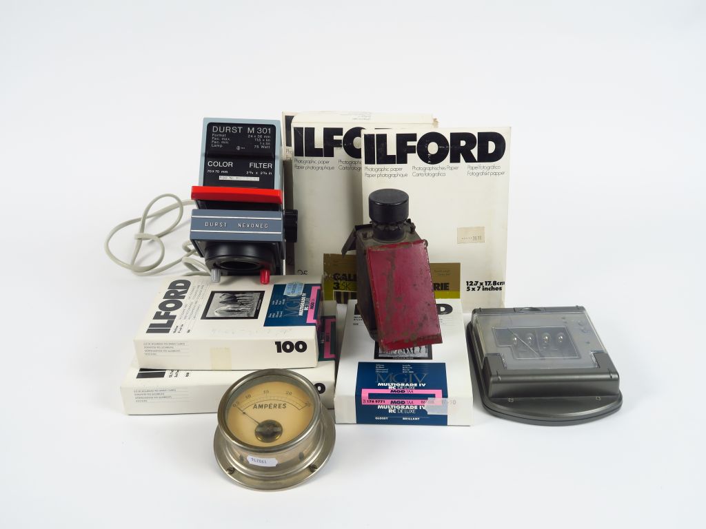 DURST M301 avec tête color. On y joint : - petite lanterne de laboratoire - Rechargable batteries - Quatre pochettes papier Ilford 13x18 - Une boite papier Ilford 10x15 non ouverte