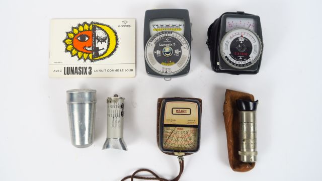 Ensemble de celulles et photomètres : Lunasix 3-Réalt Ile de France – Bisix 2- posomètre James boîte- Lios Ultra étui