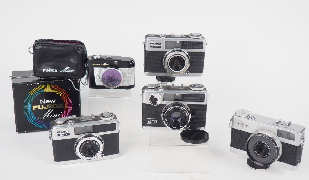 FUJICA. Lot de cinq appareils photographiques : - HALF n°290375 avec objectif FUJINON 1:2.8/28 - RAPID D1 n°195263 avec objectif FUJINON 1:2.8/28 - DRIVE n°305381 avec objectif 1:2.8/28 - HALF 1.9 n°657122 avec objectif FUJINON 1:1.9/33 - MINI n°229470 avec housse et sa boite d'origine