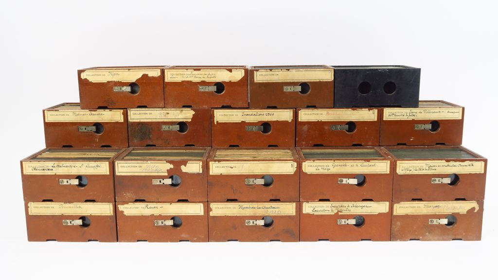 Gaumont : Borne Stéréo 944 format 6x13 petit accident à un oculaire , avec 29 classeurs de 20 vues (380) sujet divers, voyage, paysage