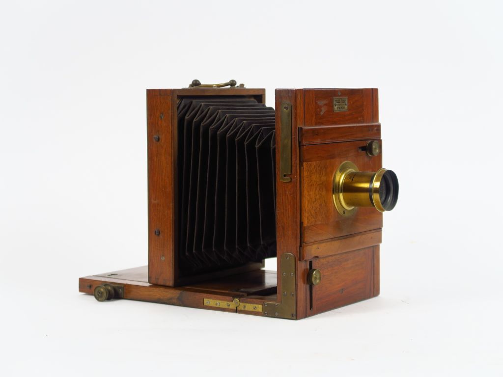 GILLES FRERES. Chambre touriste en acajou 13x18 avec un soufflet marron. Objectif laiton Gilles Frères, système à vannes. Ferrures laiton.