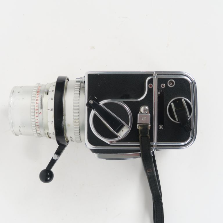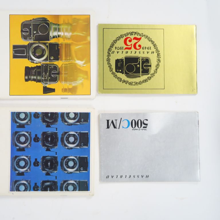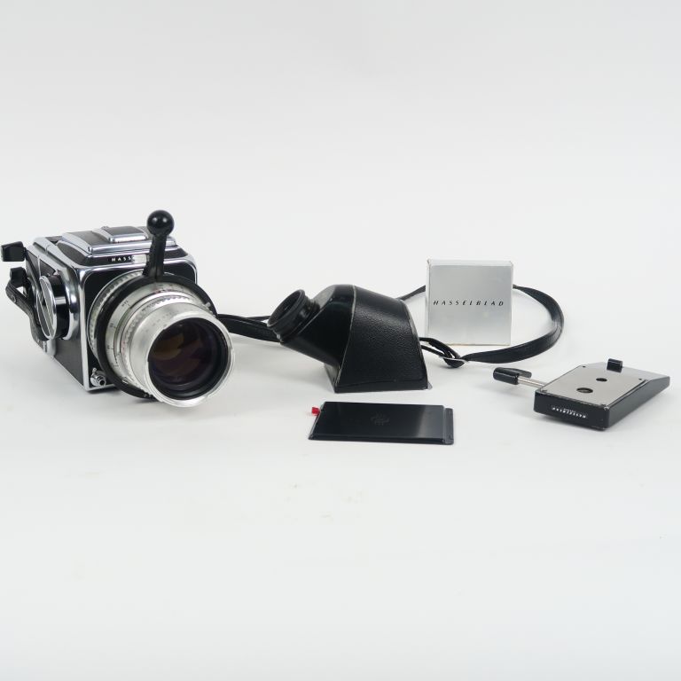 HASSELBLAD 500C et objectif CARL ZEISS SONNAR 1 :4 f=150 mm n°5270268 (léger choc) + viseur à prisme + plateau de fixation rapide + volet de protection arrière + couvre objectif arrière + mode d’emploi et catalogues d’accessoires. L’ensemble dans une mallette en tôle aménagée.