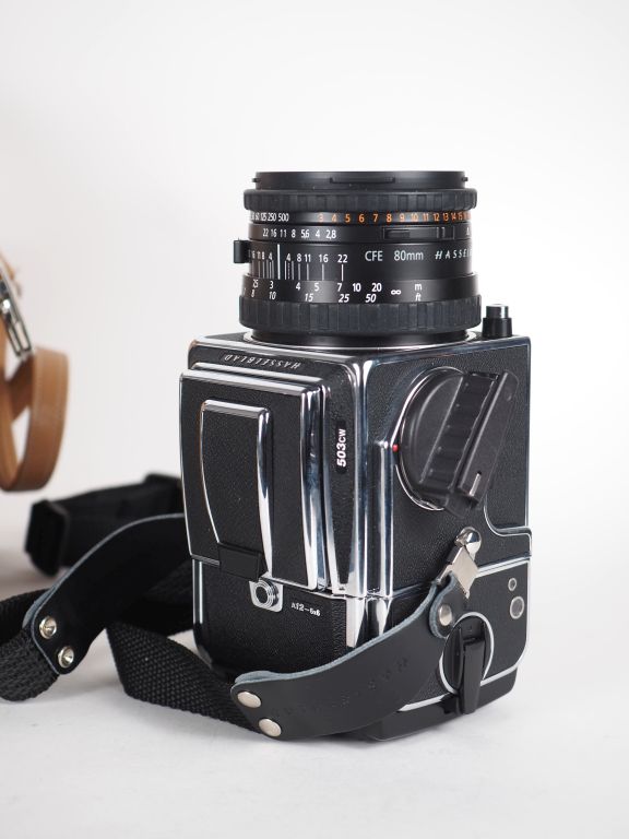 HASSELBLAD. Appareil photographique 503 CW n°19SV31077 avec objectif Carl Zeiss Planar 2,8/80 n°8873390, dos A12-6x6 n°30SS21592 avec sa courroie et sa sacoche d'origine. On y joint un parasoleil HASSELBAD, un viseur POLARIS spotview 10 et un flash meter. Très bel état.