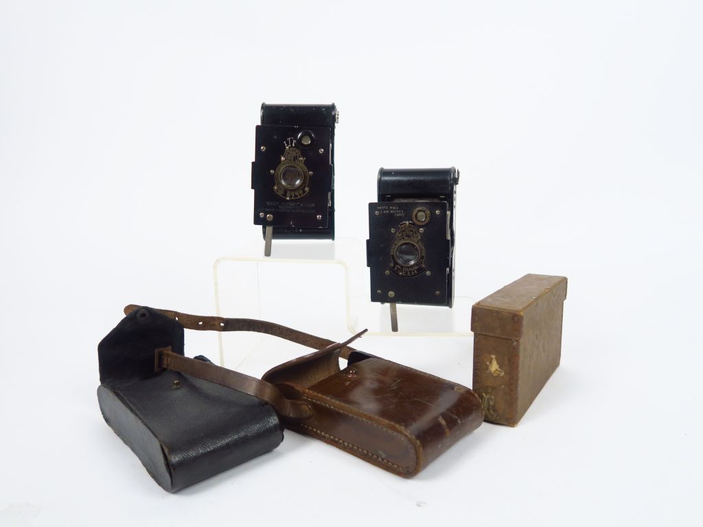 KODAK. Deux Vest Pocket avec stylet. Objectif Hermagis, inscription Photo Hall avec étui pour l'un. L'autre, objectif Demaria-Lapierre avec étui. Une boite. Deux lentilles.