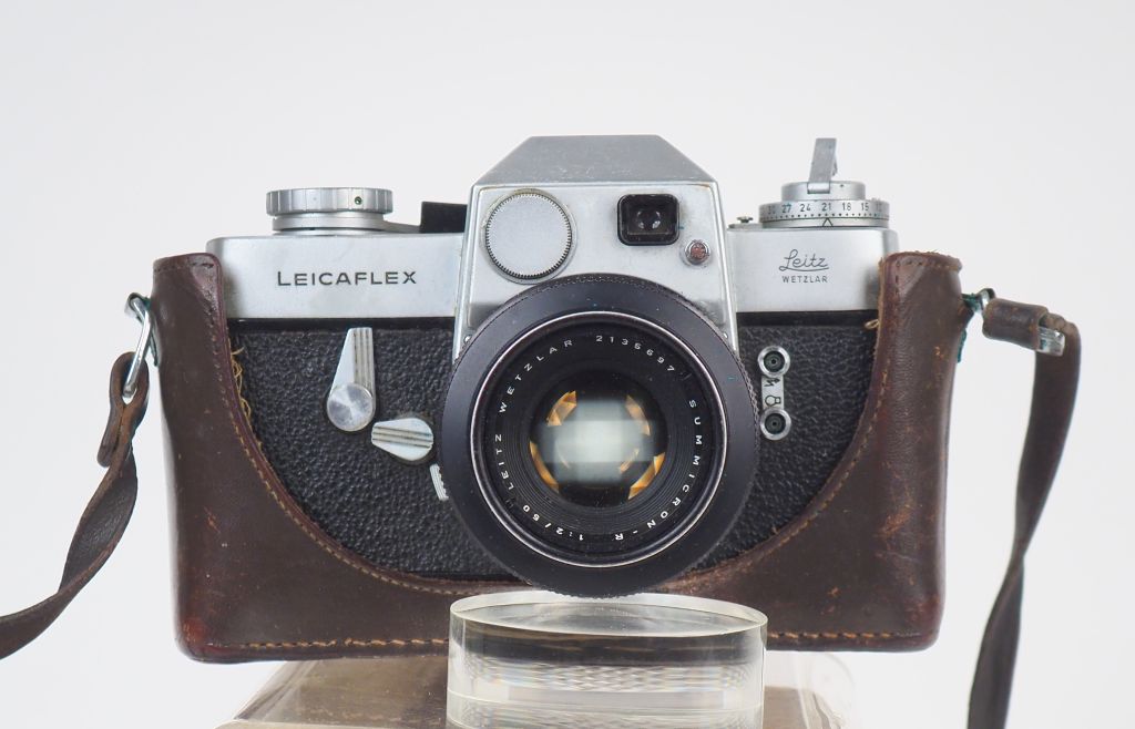 LEICA FLEX n°1115584 avec objectif LEITZ WETZLAR Summicron - R F=50 mm/1:2 n°2135697 avec sa housse. (état d'usage)