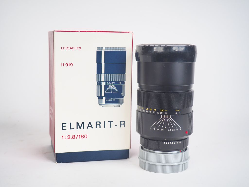 LEITZ LEICAFLEX Elmarit-R 1:2.8/180 mm n°2281591. Objectif avec sa boi...