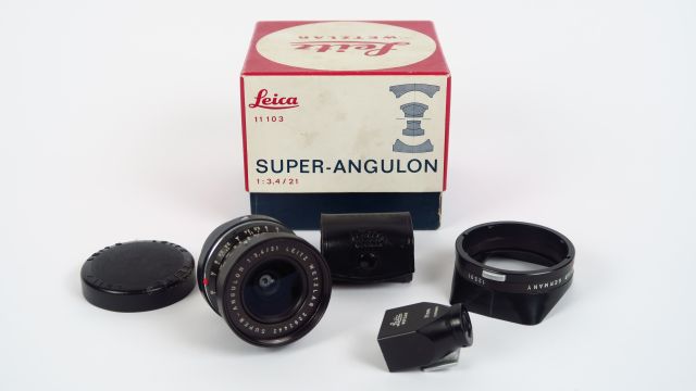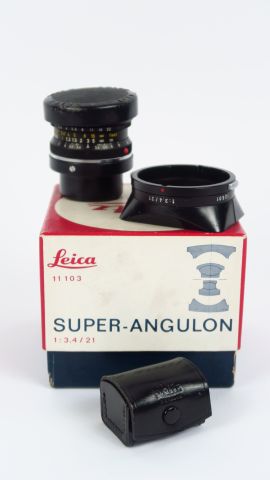 Leitz : Super Angulon 3,4/21mm N°229442 Wetzlar parasoleil, viseur 21mm noir ,étui, boîte Cond : Bel état
