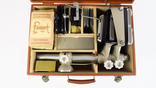Linhof : Kardan Color 4x5 inch objectif Heliar 4,5/15cm sur obturateur compur objectif Topor 5,6/150 obturateur Seiko, soufflet compendium, dos 56x72 boîte, 3 chassis 6x9 Linhof, 4 chassis métal, mallette Cond : Bel état