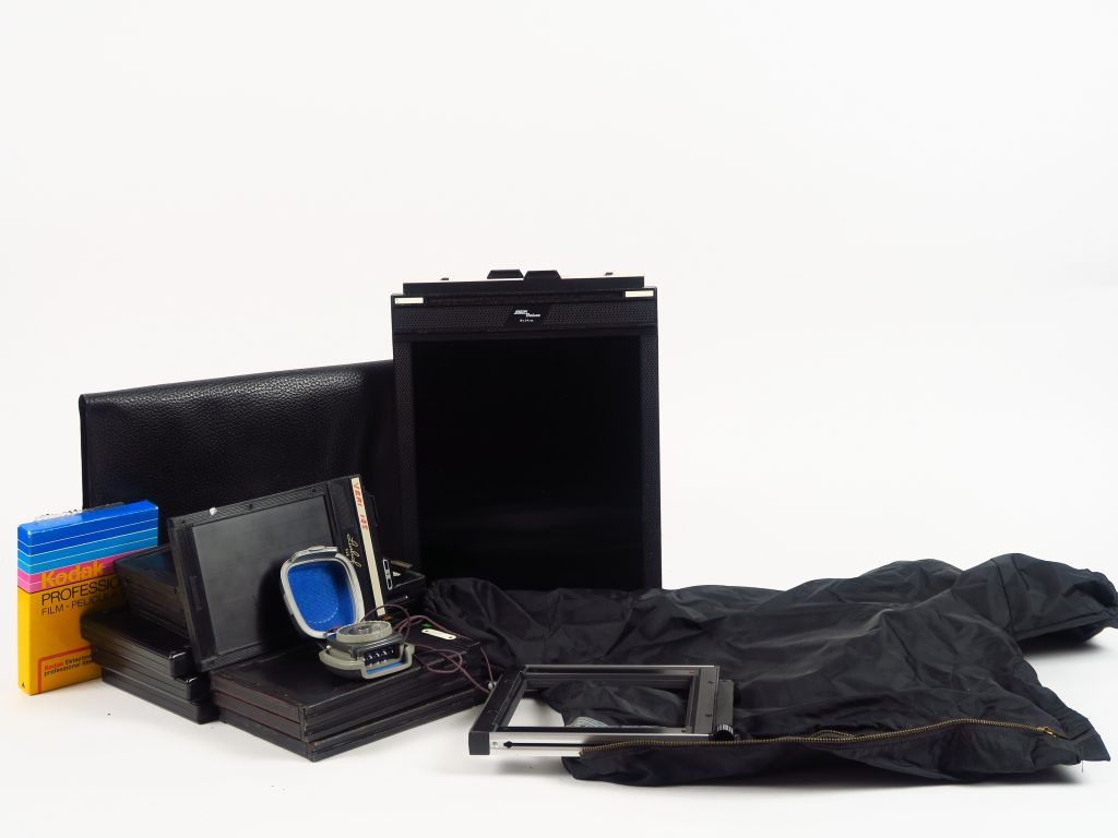 LINHOF : - Trois châssis double 13x18 - Cinq châssis double 4x5 - Trois châssis double 4x5 sans marque. On y joint un chassis Fidelity 18x24. Un adaptateur pour châssis, un manchon chargeur, une cellule Gossen Sixtino 2.
