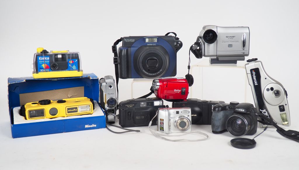Lot comprenant onze appareils photographiques ou caméras modernes. (état d'usage)