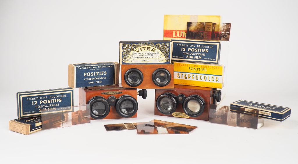 Lot comprenant trois différentes visionneuses stéréo , cinq boites de positifs sur Nîmes, cauterets, courses de taureaux et deux boites de plaques en verres pour verascope RICHARD.