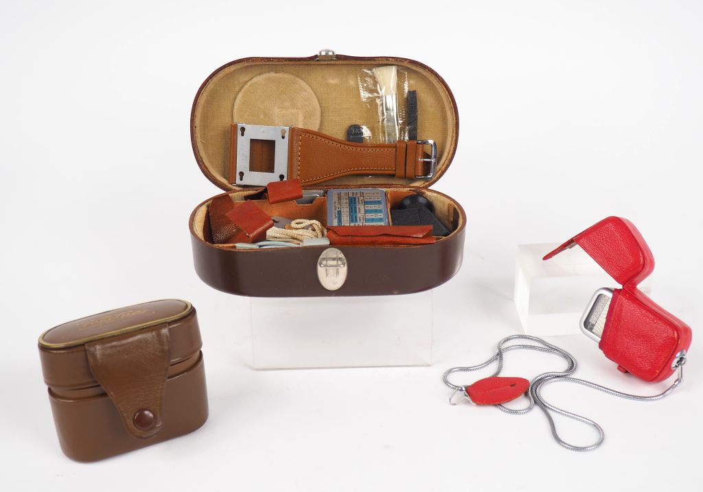 Lot comprenant : - VOIGTLANDER petit coffret d'accessoires - TESSINA étui pour appareil photographique miniature - Cellule photo