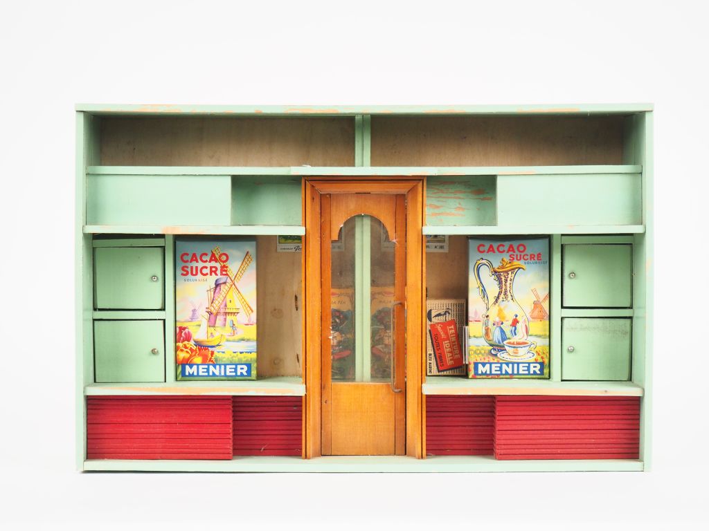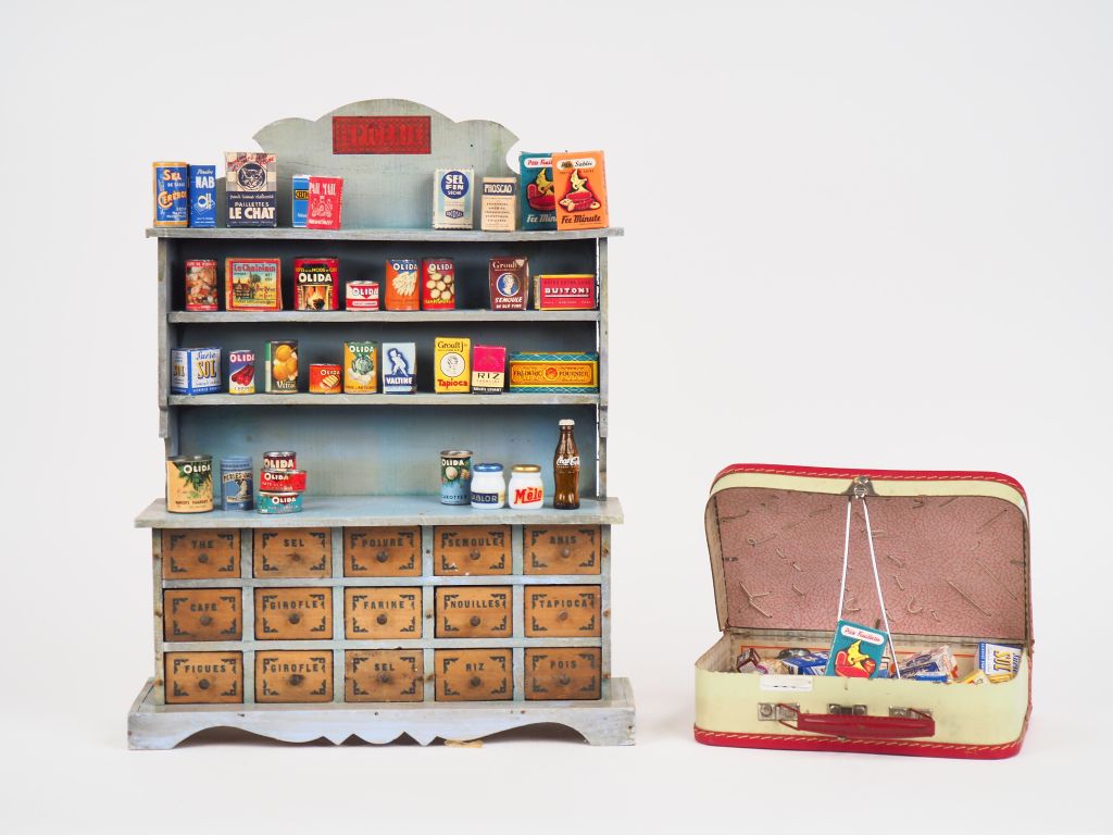 Lot de 2 épiceries anciennes garnies avec ses accessoires des années circa 1920 et 1950.