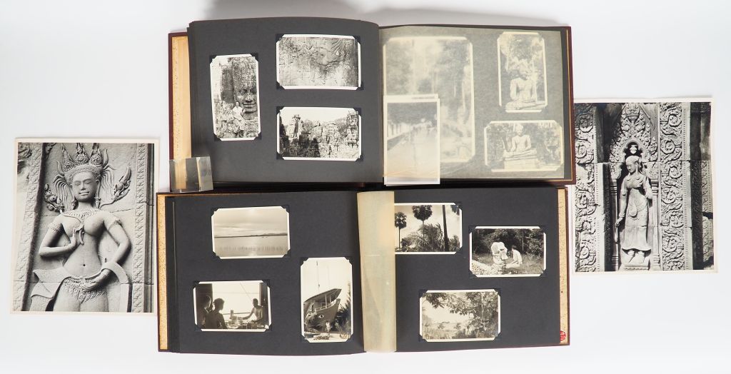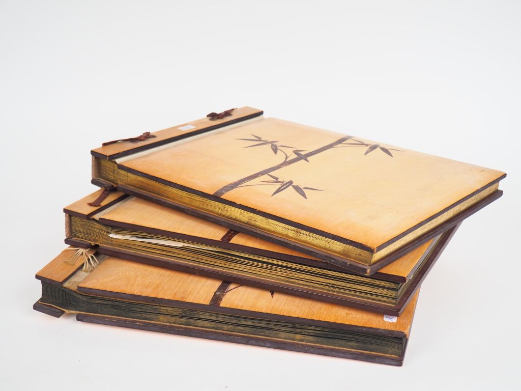 Lot de 3 albums photographiques de voyage en Asie du Sud Est, reliure en bambou de style Extrême Orient.