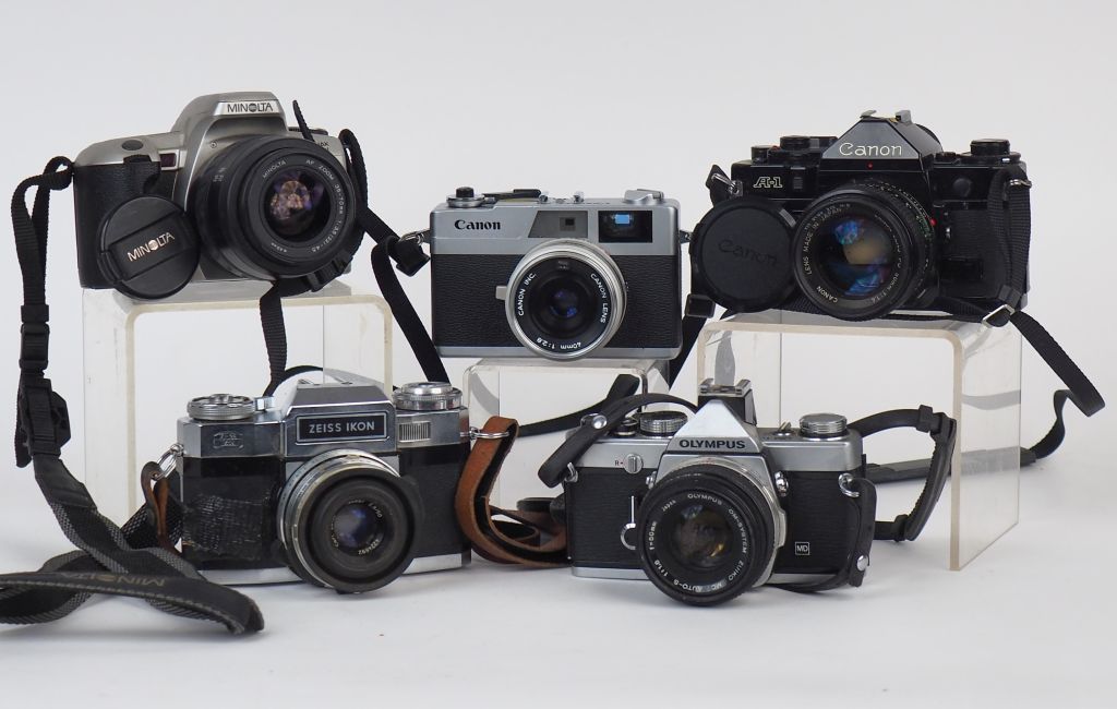 Lot de cinq appareils photographiques : - OLYMPUS OM -1 n°1974597 avec objectif - CANON CANONET 28 n° F96016 - CANON A-1 n° 593879 avec objectif - ZEISS IKON n° K93010 avec objectif - MINOLTA DYNAX 505 SI n° 96809204 avec objectif