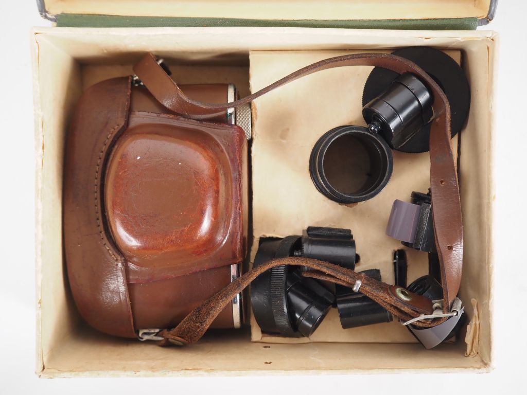 Lot de cinq appareils photographiques russes, dont un dans sa boite d'origine.