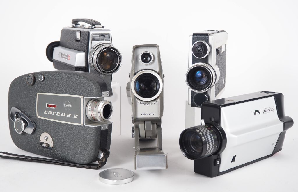 Lot de cinq caméras : - BAUER TOP STAR n°3275633 - ELMO SUPER 103T n°352576 - GEVAERT CARENA 2 - AGFA MICROFLEX 100 n°K4345 - MINOLTA MINOLTINA 8 n°115750