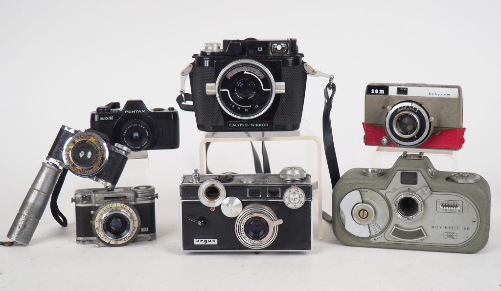 Lot de sept appareils photographiques : - ARGUS (état d'usage) - ZEISS IKON MOVINETTE 8B - SEM BABY SEM (état d'usage) - NIKKON CALYPSO - 3 APPAREILS PHOTOS miniatures (2 appareils ELGY LUMIERE, un PENTAX auto 110 (état d'usage)
